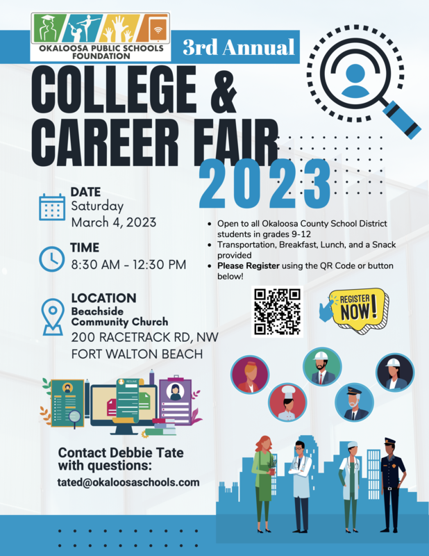 All 9th through 12th grade students enrolled in Okaloosa County School District public schools are invited to attend the 3rd annual College and Career fair hosted by the Okaloosa Public Schools Foundation. The event takes place Saturday, March 4th from 8:30am to 12:30pm at Beachside Community Church in Fort Walton Beach. Breakfast and lunch are provided as well as transportation for those who request it. Students should register as seats are limited. Parents, you are invited to attend, however, there is no need for you to register. If you have any questions, please contact Debbie Tate!