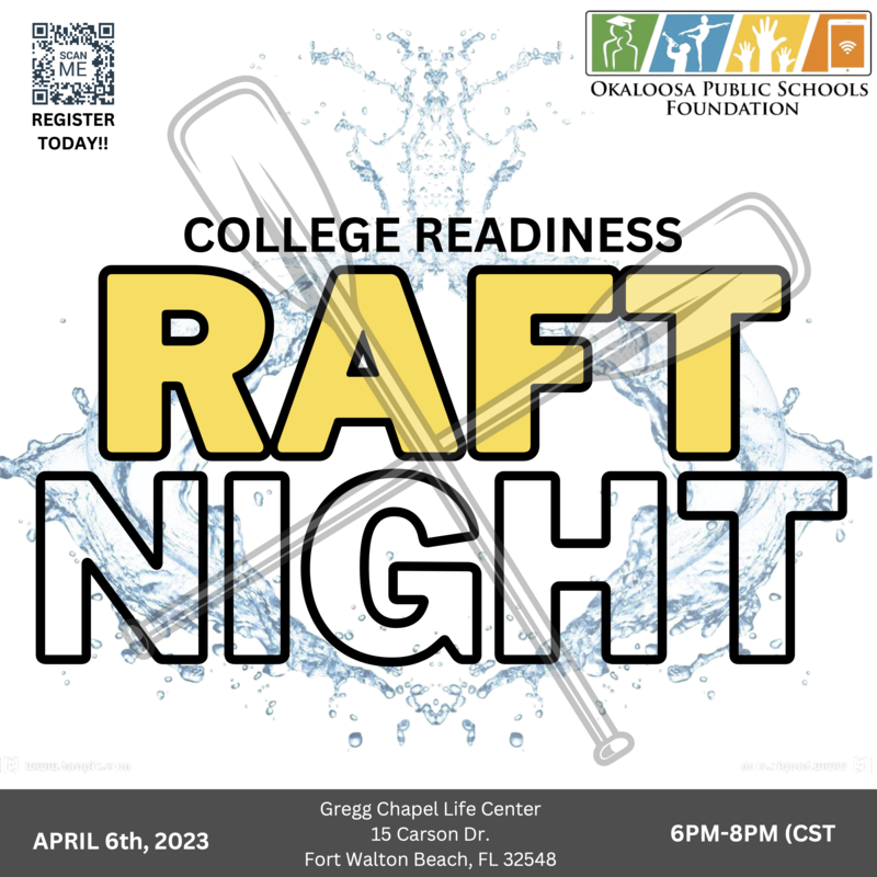The College Readiness RAFT Night is an opportunity for parents and students to hear important information that will benefit students who are interested in attending college. Guest speakers from the Department of Education will provide information about Bright Futures and College Board will provide valuable and engaging information regarding resumes, financial aid, college admissions, and SAT.