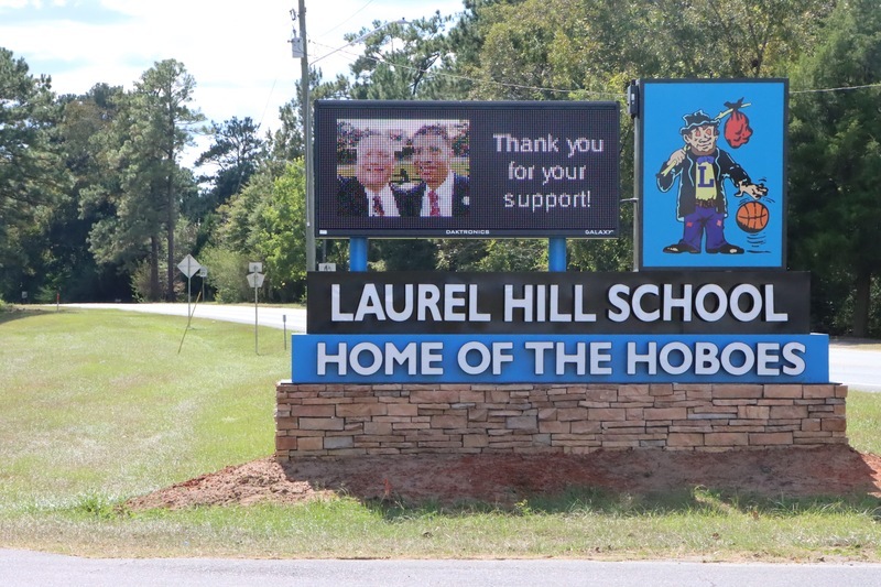 The original sign was installed in the 80s. People from out of town stop to take photos by the sign because of Laurel Hill School’s unique mascot- the Hoboes. Superintendent Chambers mentioned that “the sign is an enhancement for the school and community, but most importantly for the students because their accomplishments can be displayed for everyone that drives by to see.” Mrs. Lee Martello, Principal of Laurel Hill School, shared her appreciation of Chairman Bryant, who helped purchase the new sign, Superintendent Chambers for his support, Dr. Kelley, who was a student, teacher, and principal of the school, and Mayor of Laurel Hill, Robby Adams, for their enthusiasm and commitment to the school and community.